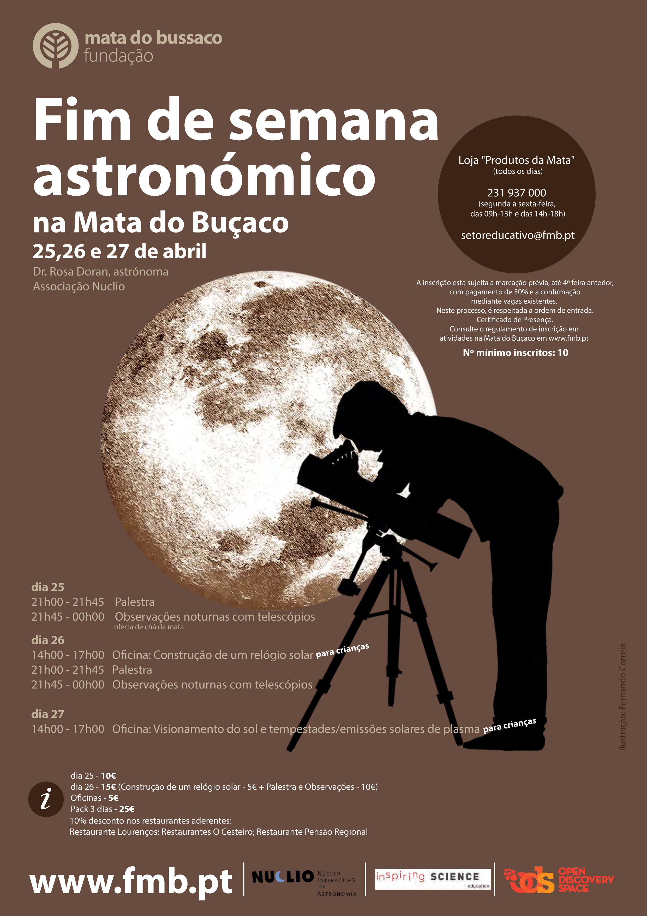 A Fundação Mata do Buçaco e o Núcleo Interactivo de Astronomia vão realizar o Fim de Semana Astronómico, na Mata Nacional do Buçaco, de 25 a 27 de abril. Orientado pela astrónoma e especialista da área Rosa Doran, este evento inclui várias palestras, oficinas e observações noturnas, para crianças e adultos.