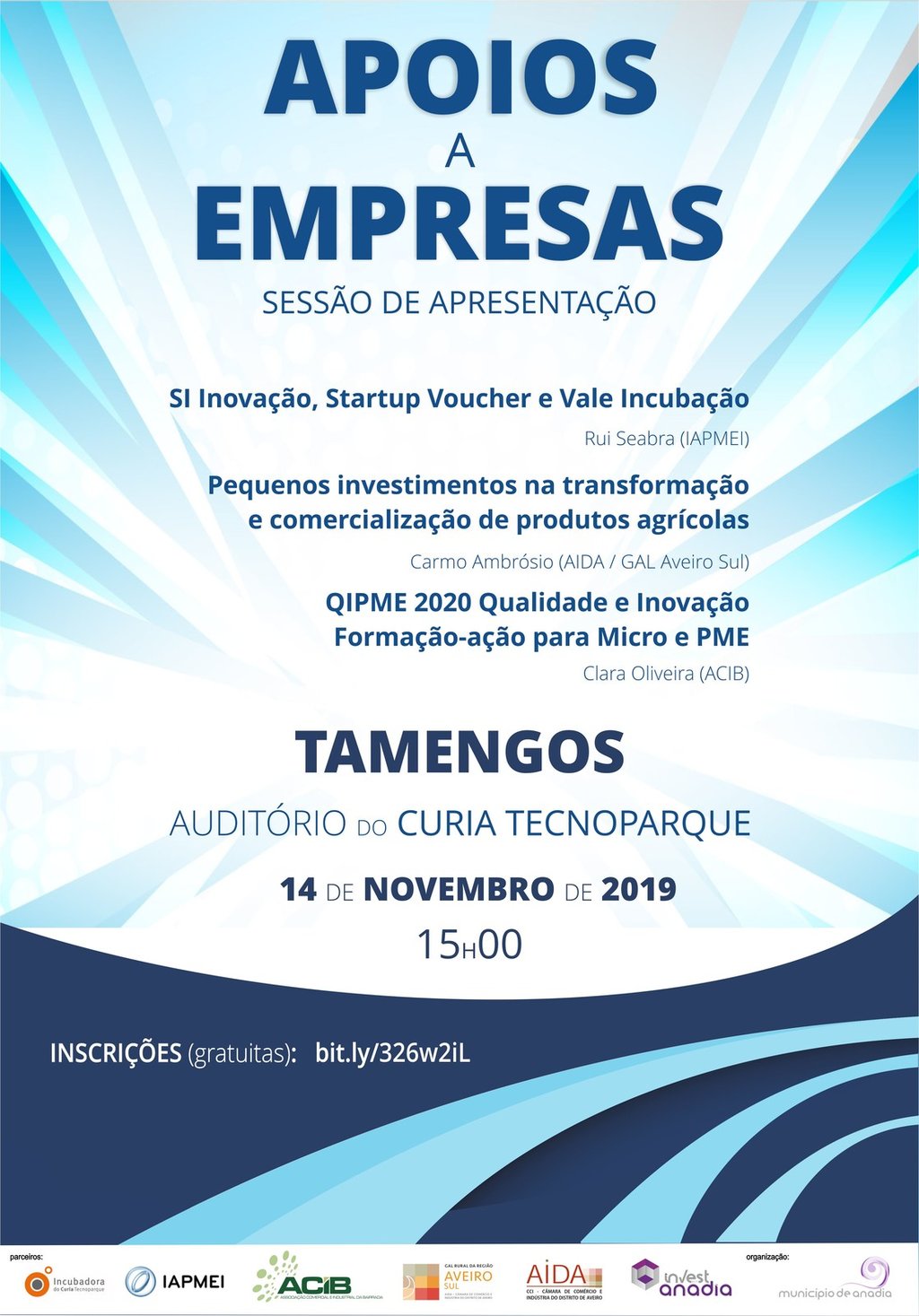 O auditório do Curia Tecnoparque, em Tamengos, Anadia, recebe, no dia 14 de novembro, pelas 15h00, uma sessão de apresentação sobre “Apoios às empresas”. O evento é gratuito, mas de inscrição obrigatória e limitado à capacidade do auditório.