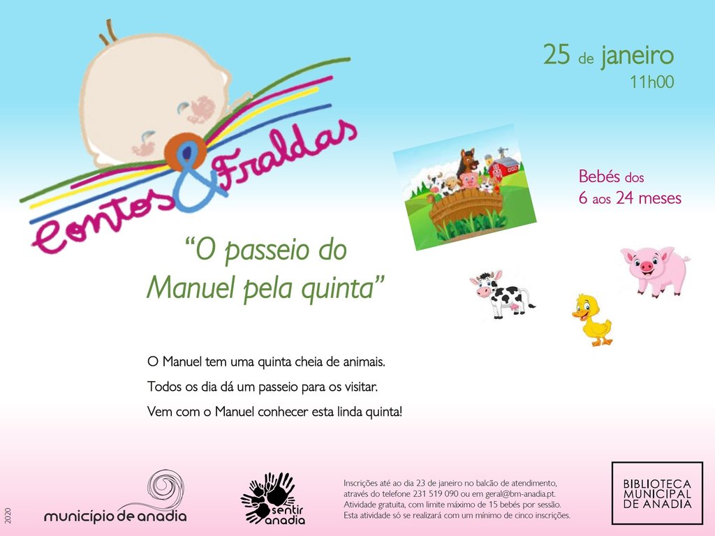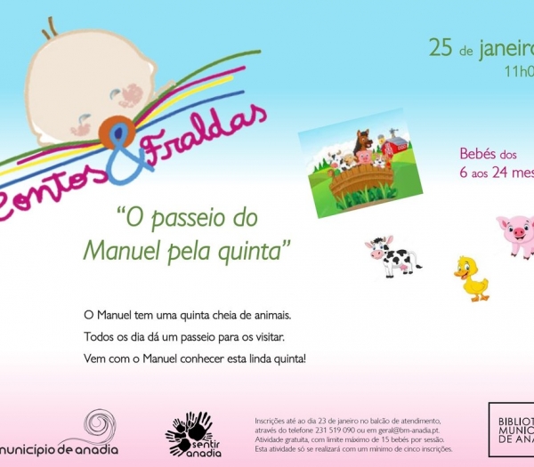 No próximo dia 25 de janeiro, pelas 11h00, a Biblioteca Municipal recebe mais uma sessão de "Contos&Fraldas" sobre a história "O passeio do Manuel pela quinta". Atividade dirigida a bebés dos 6 aos 24 meses.