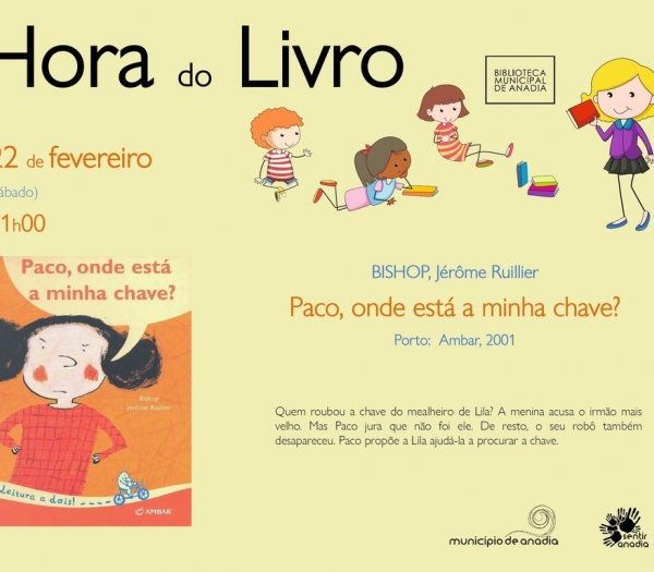 A Biblioteca Municipal de Anadia acolhe, no dia 22 de fevereiro, pelas 11h00, mais uma sessão da "Hora do Livro" onde seá dada a conhecer a história "Paco, onde está a minha chave?", de Jérôme Ruillier Bishop.